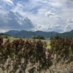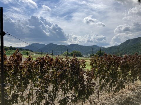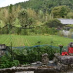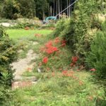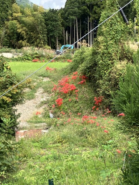 そしてもうひとつの楽しみが、「志ば久」さんの紫蘇畑近くに設えられている 「見晴し台」。残念ながら畑はきれいに耕されていたが、少しばかりの赤紫蘇が干されている。大原の赤紫蘇は古来からある原品種に最も近いもので、それを残すために各農園では毎年秋には種を採取する。今はそのための乾燥の時期のようだ。「見晴し台」からは、山々に囲まれた田畑広がる大原の里を望むことができる。赤い曼珠沙華が畔にきれいに咲きそろい、秋の風情を少しばかり感じさせてもらった。