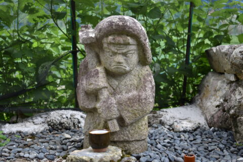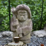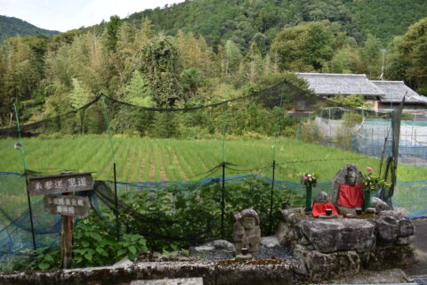 大原のバス停から呂川沿いの道を少し歩き、呂川茶屋さんの横の細い道を律川方面に向かう。田畑広がるのどかな景色を眺めながら静かな小径を歩いていくと、目印の 「田の神さま」 の前に出る。「お久しぶりです!」とご挨拶しながら「田の神さま」の顔をよくよく見れば、意外に厳しい表情。