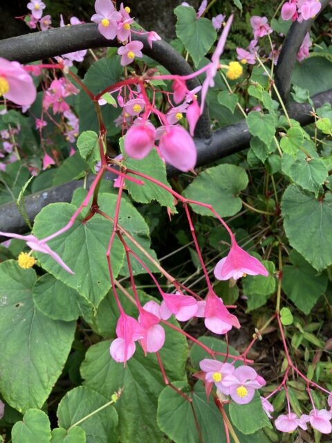 呂川沿いの小径は、木立に覆われた日陰の道なので、ひんやりとして心地良い。所々に秋海棠 (シュウカイドウ) の花が、ちょっぴりうつむき加減にひっそりとピンクの花を咲かせている。秋海棠は乾燥が苦手で、湿り気のある場所でよく育つので、この場所は生育にピッタリなのだろう。三千院や寂光院、古知谷阿弥陀寺など大原の寺院ではよく見かける。