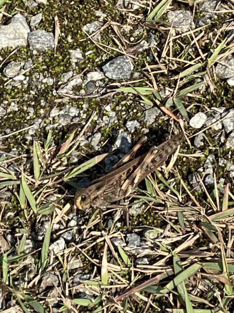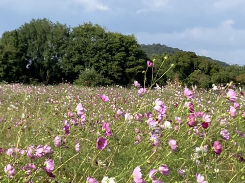 11月も近く “コスモスはまだ咲いているかな?” という私の心配をよそに、白、ピンク、濃桃色など様々なコスモスが広い花畑一面に咲き乱れ、風に揺れている。よく見れば花にも微妙な違いがあり、"コスモスってこんなに色々な種類があるんだ!" と驚き。また中央付近にはススキが群生しており、陽光に光り輝くススキの穂とピンクのコスモスの取り合わせも秋らしい。そしてその近くでは、ノゲイトウ (セロシア) がロウソクのようにツンツンと咲いている。ドライフラワーみたいだけど、可愛い。花畑を歩いていると、バッタがピョンピョン飛び跳ねているのに出会い、豊かな自然がここにはあるって感じた。