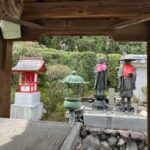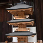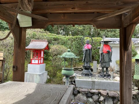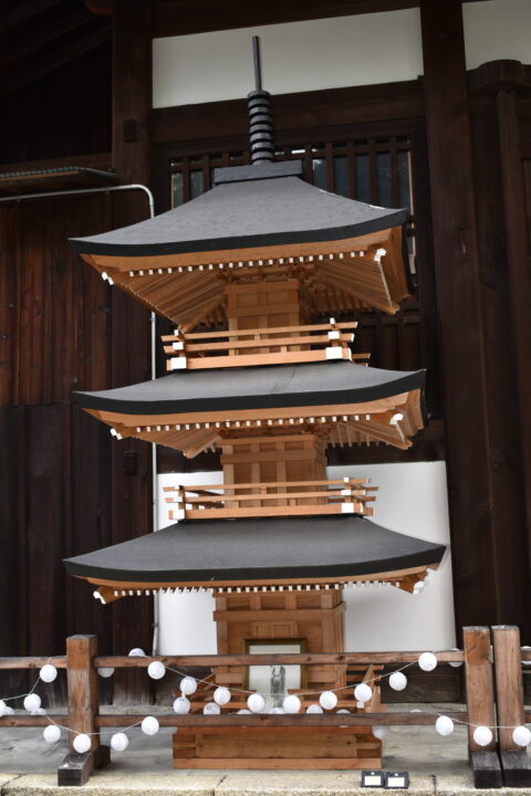 本堂の南西側には「おたすけ大師」と「子そだて地蔵尊」の石像、さらに奥には火伏せの神「愛宕大明神」のお社。また本堂の軒下に新しいミニサイズの三重塔。以前にはなかったような… 昨年末に寄進されたものの本堂内に入らないので、お堂横に展示されているらしい。