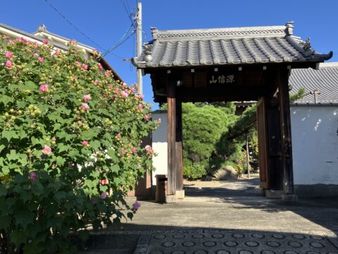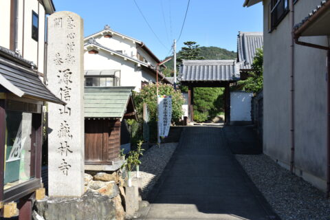 静かな住宅街にある参道前に「恵心僧都開基 源信山 蔵林寺」の寺標。その隣には、地蔵石仏を祀る小堂。参道先には瓦葺屋根の山門が見える。参拝時、山門横の芙蓉の花が咲き競い、本堂前にはこれから「臥龍松」になりそうな枝ぶりの見事な松がある。季節の草花もそこかしこに植栽されて、清々しい雰囲気の寺院だ。