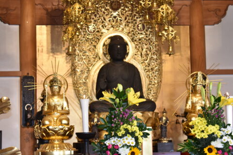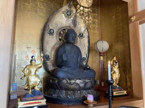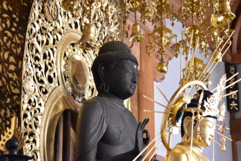 まず須弥壇中央に御本尊の阿弥陀如来が勢至菩薩 (本尊右)・観音菩薩 (同左) を従えて座している。平安時代後期の寄木造 (像高88.3cm) の阿弥陀如来は、多くの人々の祈願を受けられたのか、煤で黒ずんでいる。どちらかと言えば小顔で、頭部螺髪も小さい。対照的に額の白毫は大きく光り輝き、スッと通った鼻筋に小さな唇。少年のような若々しさが漂う。丸みを帯びた両肩を覆う通肩の衣は、座した膝の上にゆったりと掛かっている。