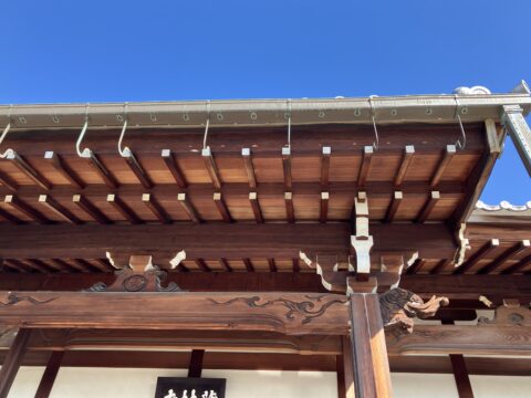 桟瓦葺き三間三面の比較的新しいお堂。瓦の先の蓮の丸い蕾 (未敷蓮華?) が珍しい。庇の蟇股には浄土宗の宗紋「月影杏葉」が刻まれ、象の木鼻が付けられている。堂内はさほど広くはないが、折上げ格天井の内陣は、煌びやかに荘厳されて、さすが「浄土宗」寺院といった感じ。