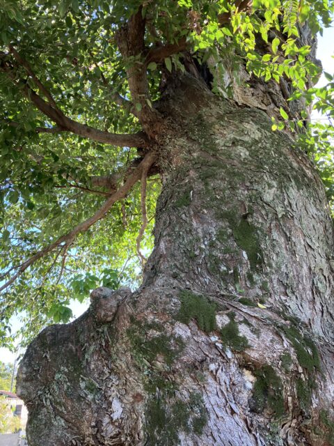本堂裏にある御神木のムクノキは、推定樹齢500年ほどと言われる古木。宇治市名木百選 (S56年3月1日認定)に選定されており、樹高18m、幹周4.9mと説明板にはある。太い根元部分に空洞があり、主幹が一本折れているようだ。傍には小さなお社が建っている。