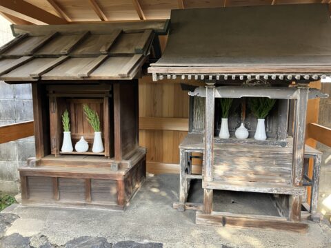 *その他、摂社・末社の小さな祠がいくつかあり、三輪・伊勢・賀茂・石清水・二天夜刃 (やしゃじん)・役氏小角 (役小角?)・稲荷・弄鈴 (なるこ)・王仁 (わに)・空海大神が祀られていると案内板には書かれているが、どの社なのか、またどういう神なのか判然としない。