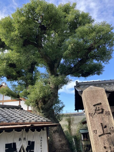 東寺の塔頭 宝菩提院の北側の静かな住宅街に、小さなお社「石上神社」がある。正式には「石上布留社 (いそのかみふるしゃ)」といい、弘法大師空海の生母の実家 阿刀 (あと, あとう) 家の祭壇であった。また「弘法大師のお地盤 (じば) の明王」と呼ばれる「波切不動明王」も、境内に祀られている。