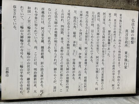 弘仁14 (823) 年 嵯峨天皇は、官寺であった「東寺」を空海に託す。この時、空海の父の実弟で、阿刀家の女婿となった阿刀大足 (おおたり) が東寺執行 (しぎょう) となり、以後、東寺執行家 (真言宗政所) の宰主は、阿刀家が歴代世襲。