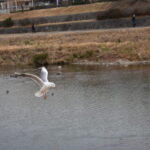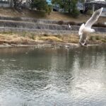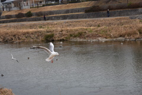 河原を三条大橋から四条大橋の方に歩いていくと、南座がよく見える辺りで別のユリカモメの群れが飛び交っている。川の流れに揺蕩うていたかと思えば、突如として空中に向かって飛び出してを何度も繰り返し、見ていて飽きない。