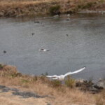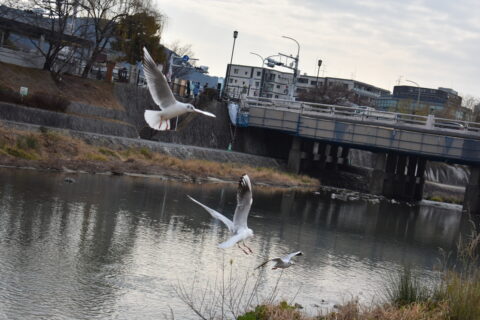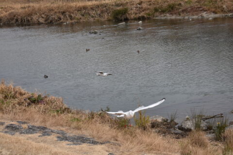 少し離れた所で様子を見ていると、川の流れにユラユラと身をまかせていたユリカモメが、ヒョイっと水面から飛び立ち滑空。水面に浮かぶ姿はなんとも愛らしいのに、羽を広げて飛び立つ姿は大きく逞しい。時折、空中で2羽のユリカモメが追いかけっこでもするかのように飛行し、そして着水。きっと遊んでいるんだろうナ!