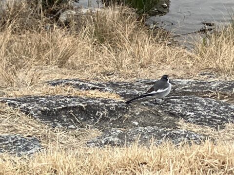 河原に下りていくと、鳥たちに餌をあげている人が…。その人の周りにはハト、セキレイ、カモそしてユリカモメ達が集っている。