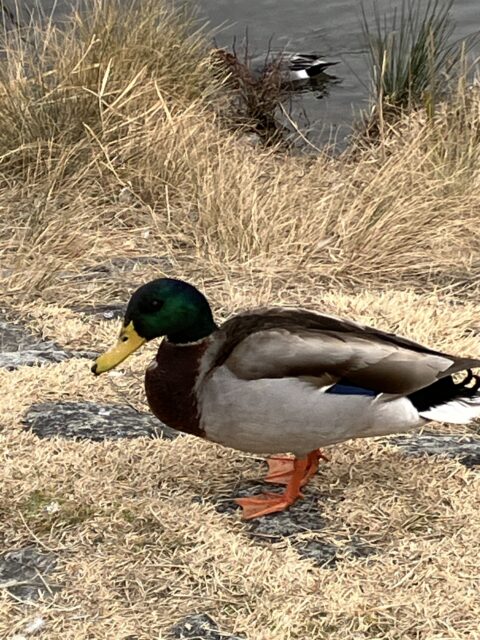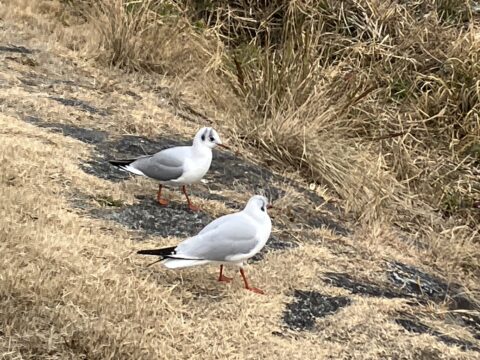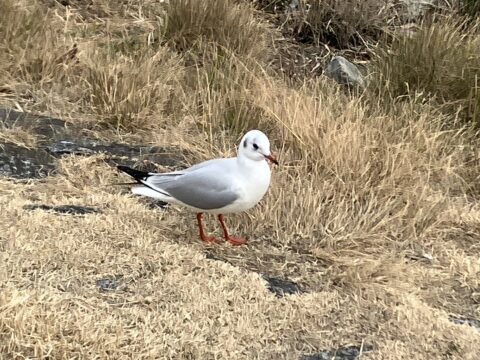 昨冬は遠くから眺めるだけだったユリカモメ。今回は、触れるほどの近さにまでやって来てくれたので、じっくり観察。朱い嘴に脚がトレードマーク。冬羽の今は、全体が白っぽく、かわいい目の後ろに黒っぽい斑点。「イヤーマフ模様」というらしい。翼は薄い青灰色だが、先端が黒い。羽を広げて飛んでいる姿を見ると、羽の先端が黒いのがよくわかる。夏羽になると頭部全体が黒くなり、まるで黒い頭巾でも被っているように見えることから「黒ずきん」と愛称されることもあると聞く。鳴き声は、見た目の可愛さとは裏腹に「ギィー」とか「ギュゥーィ」などといささか賑やか。