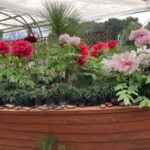 会場中央の大きな舟型容器には、色とりどりの牡丹が飾られており、早春のこの時期に思いがけない出会いだった。