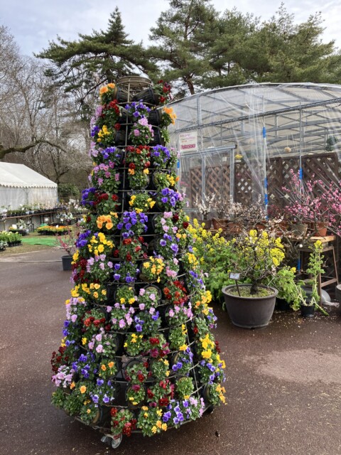 ”森のカフェ” すぐ近くに設営されたアーチ型の温室のような特設会場の前では、大きなパンジーツリーがお出迎え。入口前には、梅や菜の花が飾られて「早く入っていらっしゃい!」って誘われているよう。