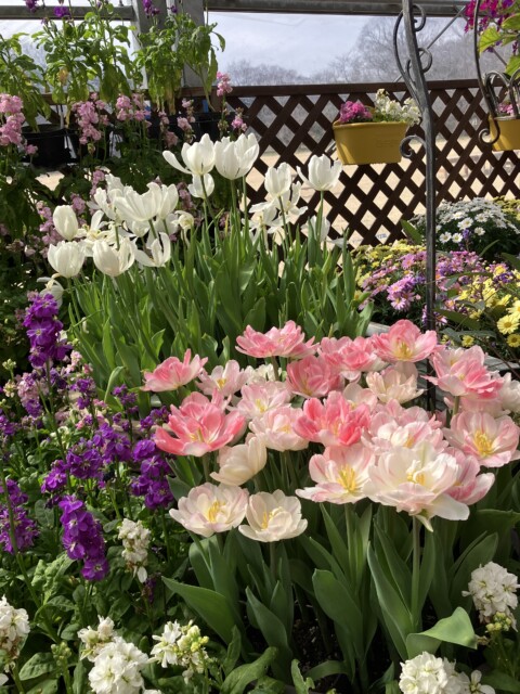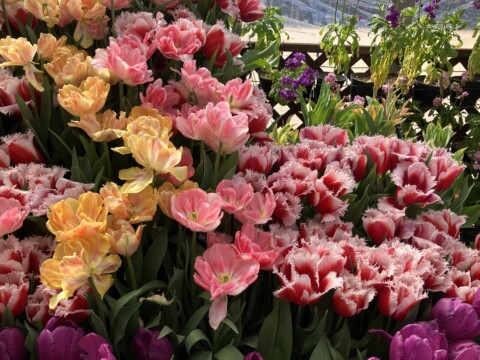 春の花と言えば、やはり ♪ さいた〜 さいた ♫ のあの花、チューリップ! チューリップにこんなに多くの種類があるとは…新鮮な驚き。オーソドックスな一重咲きから八重咲き、フリンジ咲きなど色も様々でとても鮮やか。さりげなくそれを引き立てているかのようなストックやマーガレットたちは、名脇役かな?