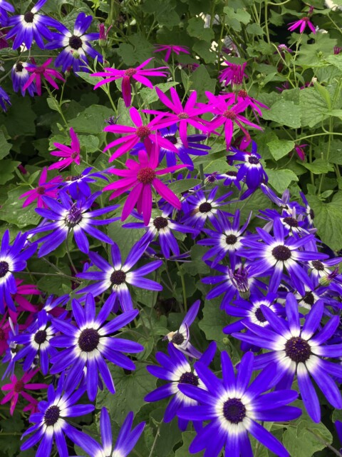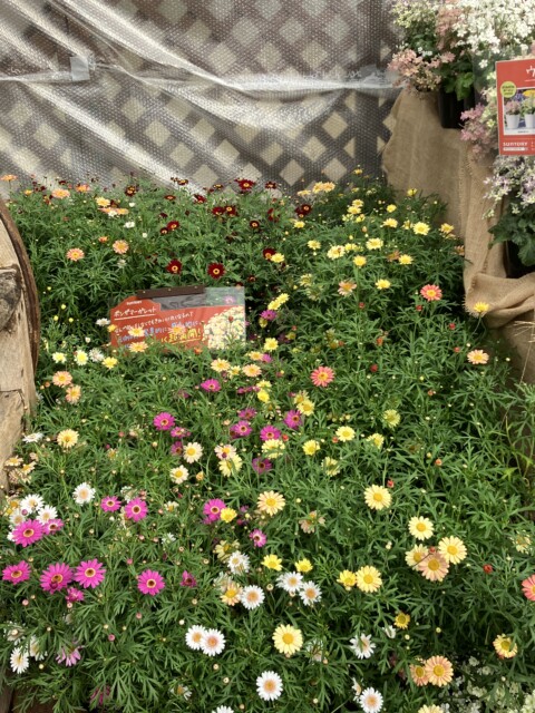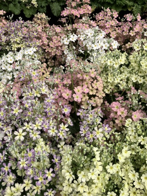 サクラソウ科プリムラ属の ウインティー (Winty) は、濃い桃色のサクラソウのイメージとは違い、どれもパステルカラー。ライムグリーンや桜を思わせる薄いピンク、青紫がかった色などがあるが、どれもグラデーションがあるのが面白い。キク科の セネッティ (Senetti) や ボンザマーガレット (Bnza Margaret) は、鮮やかな色が印象的。どれも花色の少ない時期に咲いてくれるようで、今や園芸家の人達には人気の種類とか。