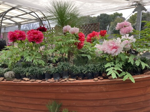 会場中央の大きな舟型容器には、色とりどりの牡丹が飾られており、早春のこの時期に思いがけない出会いだった。
