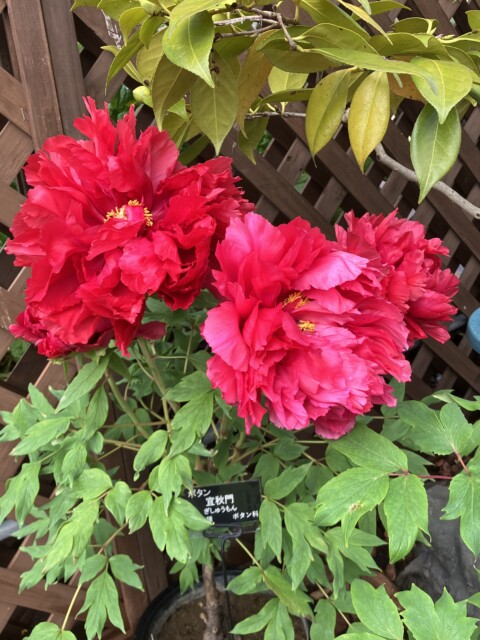 まずは松本農園 (島根県松江市) の「門名シリーズ」から二つ。「門名シリーズ」とは、昭和天皇即位を記念して皇室と関係のある京都御所の門名をつけた25品種のことという。「紫天門 してんもん」 は、光の加減によって紫から濃桃色に見える艶のある牡丹。そして 「宜秋門 ぎしゅうもん」 は、紅色でとてもゴージャスな牡丹 (「宣秋門 せんしゅうもん」と誤って表示されている場合もあるらしい)。どちらも御所に相応しい豪華さと品格のある花。